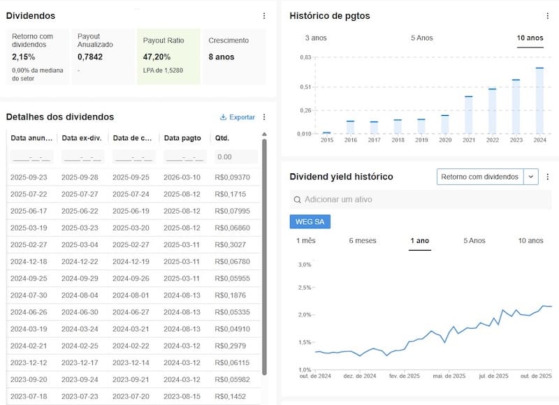- Política de Dividendos: A WEG adota uma política transparente de distribuição de resultados, pagando dividendos e juros sobre capital próprio regularmente. O último dividendo pago aos acionistas foi de R$ 0,09370 por ação em 23/09/25, demonstrando a continuidade dos pagamentos.