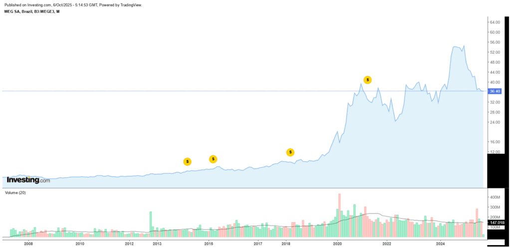 A WEG tem um histórico consistente de crescimento e valorização na bolsa de valores. A empresa está listada na B3 sob o ticker WEGE3, sendo uma das ações mais negociadas com alta liquidez e de maior peso na composição do Ibovespa.