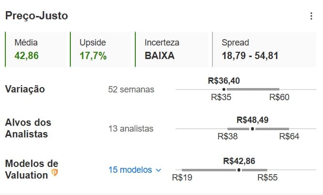 As ações da Weg têm potencial de valorização nos próximos 12 meses de 17,7% no preço-justo do InvestingPro, baseado em 15 modelos de valuation. A ferramenta de análise fundamentalista do Investing.com é menos otimista em relação à média do mercado. O preço-alvo da mediana de 13 analistas é de R$ 48,49.