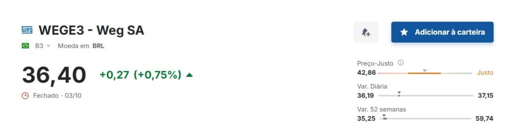 Nas últimas 52 semanas, a variação do preço de WEG ficou entre R$ 35,25 e R$ 59,74. No pregão de 3 outubro, os papéis WEGE3 fecharam em alta de 0,75%, a R$ 36,50.