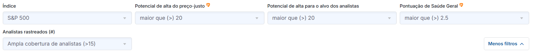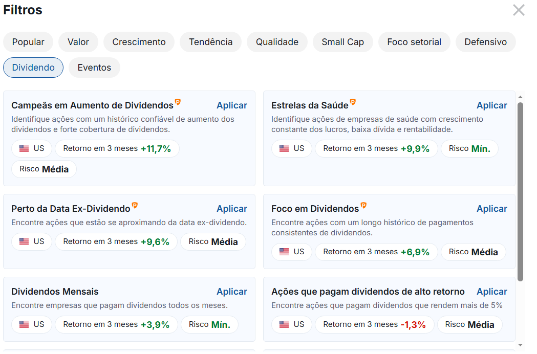 Vale lembrar que algumas dessas buscas prontas estão disponíveis exclusivamente para assinantes do InvestingPro e Pro+.