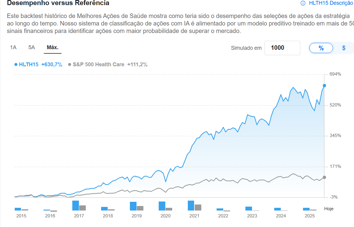 O backtest de 10 anos dessa estratégia mostra retorno superior a 630%, superando em 519% o índice S&P 500 Healthcare. Lançada ontem em condições reais de mercado, ela apresenta perfil de risco classificado como “baixo”.