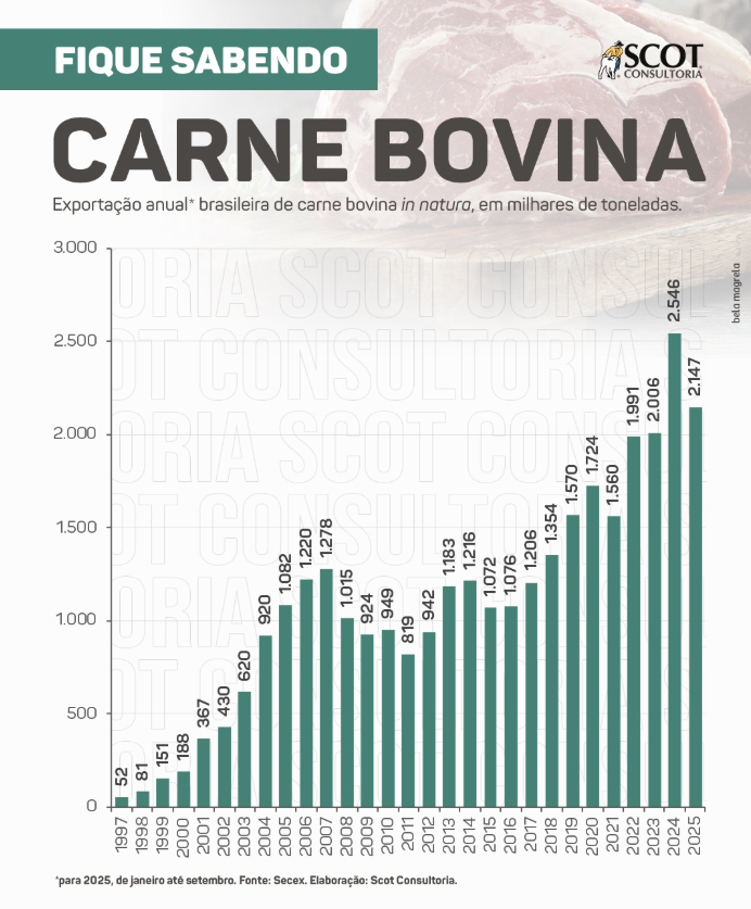 Em setembro, a exportação de carne bovina in natura foi recorde - 314,7 mil toneladas. Com o desempenho, 2025 já é o segundo melhor ano para o setor.