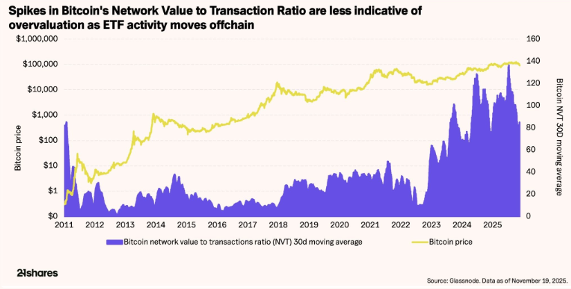 A relação NVT tornou-se menos confiável, pois muita atividade agora ocorre offchain. Leituras elevadas nem sempre indicam sobreavaliação como faziam antes, e atualizar a medida para incluir volumes e fluxos de negociação de ETF a tornará mais precisa.