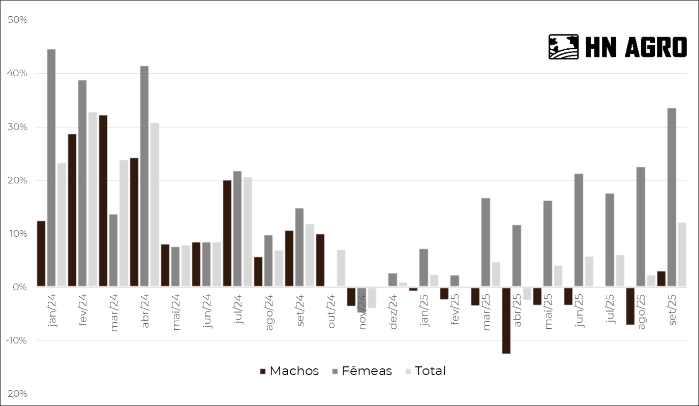 O volume de machos enviados para o abate totalizou 1,7 milhões de cabeças, alta de 6,0% em relação a agosto e de 3,2% na comparação anual. Foi a primeira vez em 2025 que o volume de machos enviados para o gancho foi maior que no mesmo período de 2024.