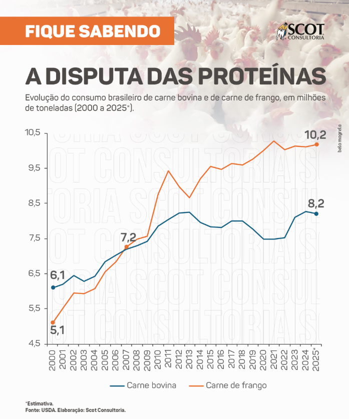 Entre 2006 e 2007, o consumo de carne de frango superou o consumo de carne de boi e, desde então, tem sido assim.