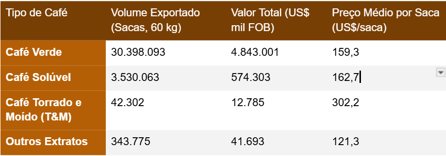 Esta tabela demonstra a disparidade de volume e valor agregado por saca de 60kg, evidenciando o baixo volume do T&M e a pouca diferença de preço do Solúvel em relação ao Café Verde (CONCEIÇÃO et al., 2019).