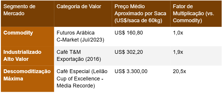 O contraste é assombroso: enquanto o café arábica commodity opera em torno de US$ 160 por saca , o café especial brasileiro, em leilões como o Cup of Excellence, alcançou um preço médio recorde de US$ 3.300 por saca (REVISTA CAFEICULTURA,). Esse prêmio de mais de vinte vezes o valor commodity é a prova cabal da viabilidade da descomoditização primária. O consumidor de alto padrão está disposto a pagar por atributos como origem, processo de fermentação e certificação (CONCEIÇÃO et al., 2019).