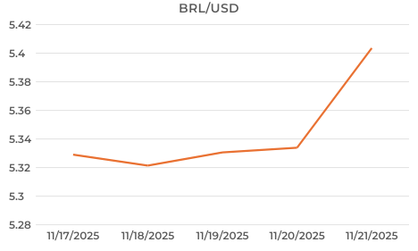A semana anterior, mesmo com o feriado no Brasil na última quinta-feira (20), Consciência Negra, trouxe volatilidade e muita “emoção” para o câmbio. O USD/BRL começou a semana cotado a R$ 5,2937, registrando sua mínima no período, chegando a tocar R$ 5,43 antes de fechar na sexta-feira (21) a R$ 5,4036, representando uma alta de 1,40% na semana.