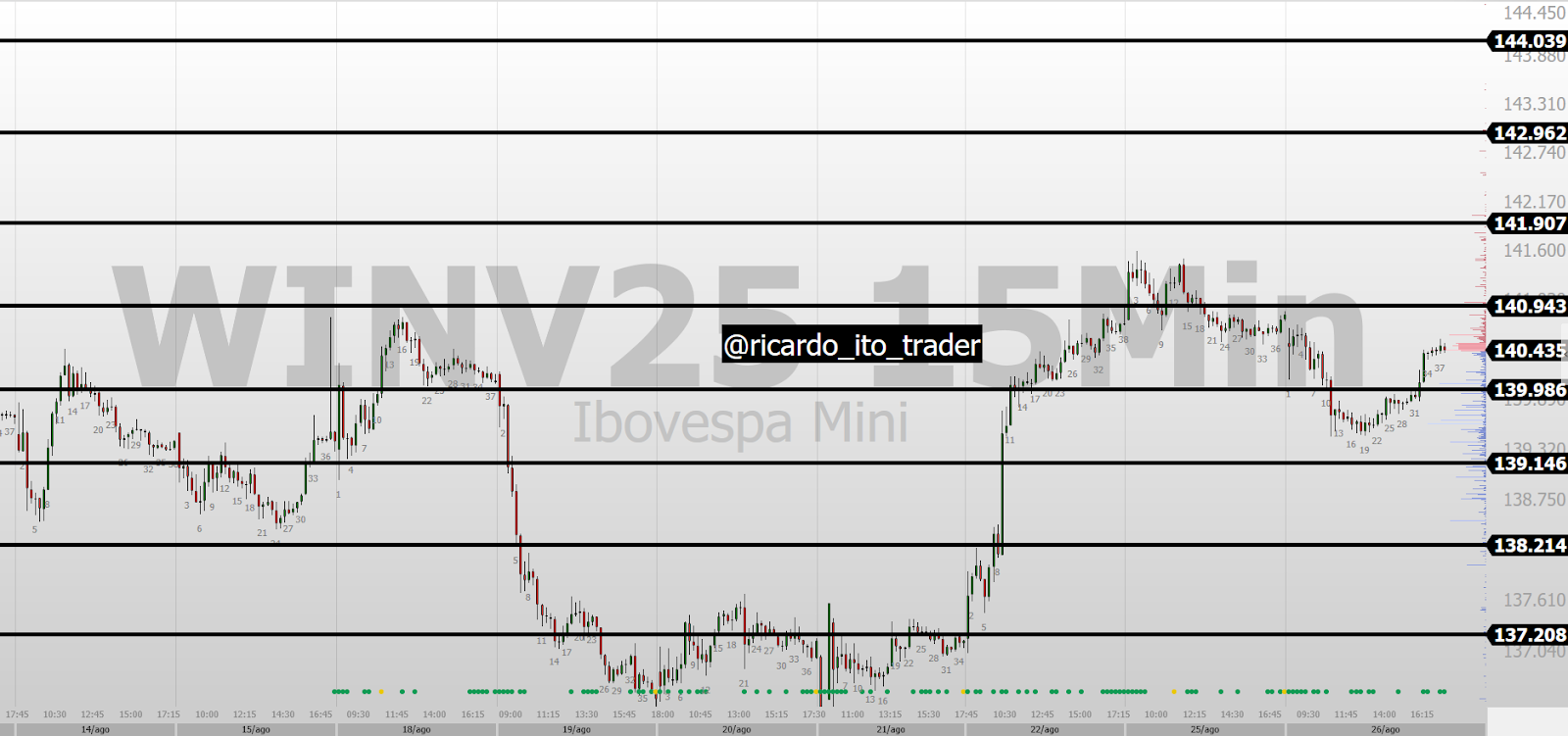 Nesta quarta-feira (27/08/2025), rompendo e trabalhando acima da região de preço 140.943, pode encontrar resistências nas regiões de preços 141.907, 142.962 e 144.039.