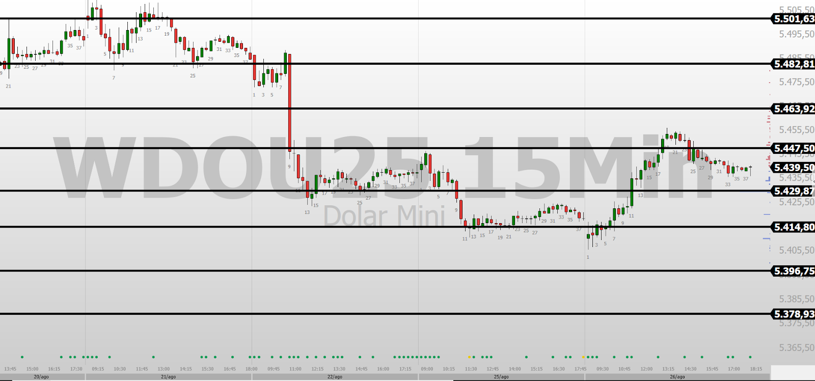 Mini Dólar Futuros com referência do fechamento em 26/08/2025 a máxima 5.456 mínima 5.405 e ajuste 5.443.