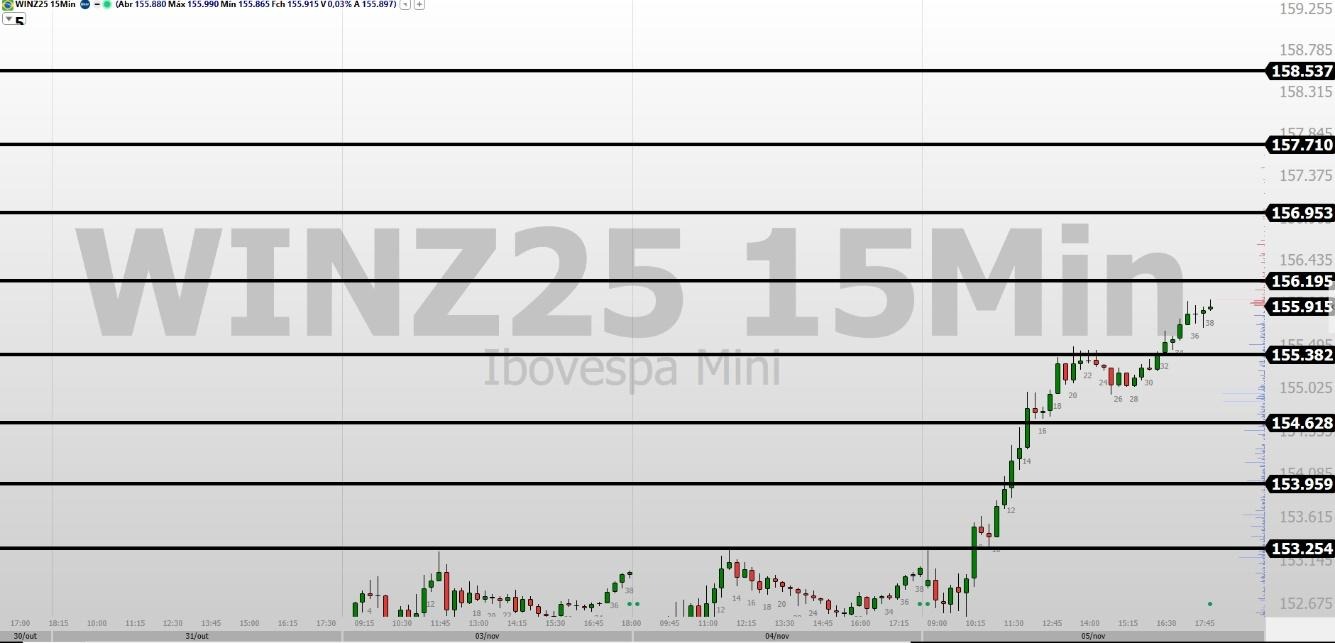 Nesta quinta-feira (06/11/2025), rompendo e trabalhando acima da região de preço 156.195, pode encontrar resistências nas regiões de preços 156.953, 157.710 e 158.537.