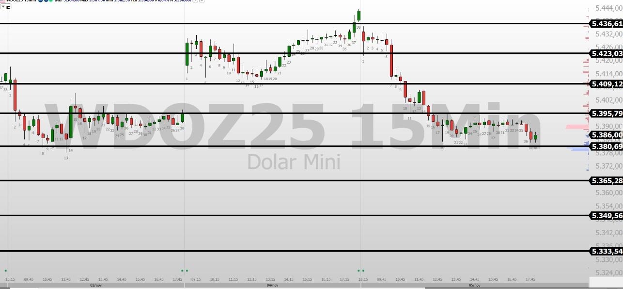 Nesta quinta-feira (06/11/2025), se o dólar futuro romper e se mantiver acima do 5.395, temos pontos de resistências nas regiões de preços 5.409, 5.423 e 5.436.