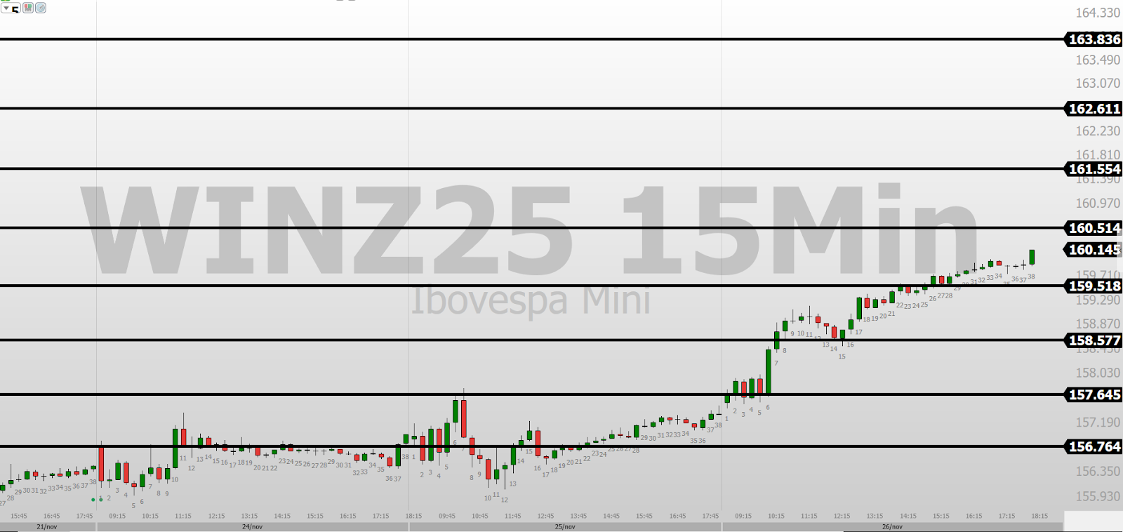 Nesta quinta-feira (27/11/2025), rompendo e trabalhando acima da região de preço 160.514, pode encontrar resistências nas regiões de preços 161.554, 162.611 e 163.836.