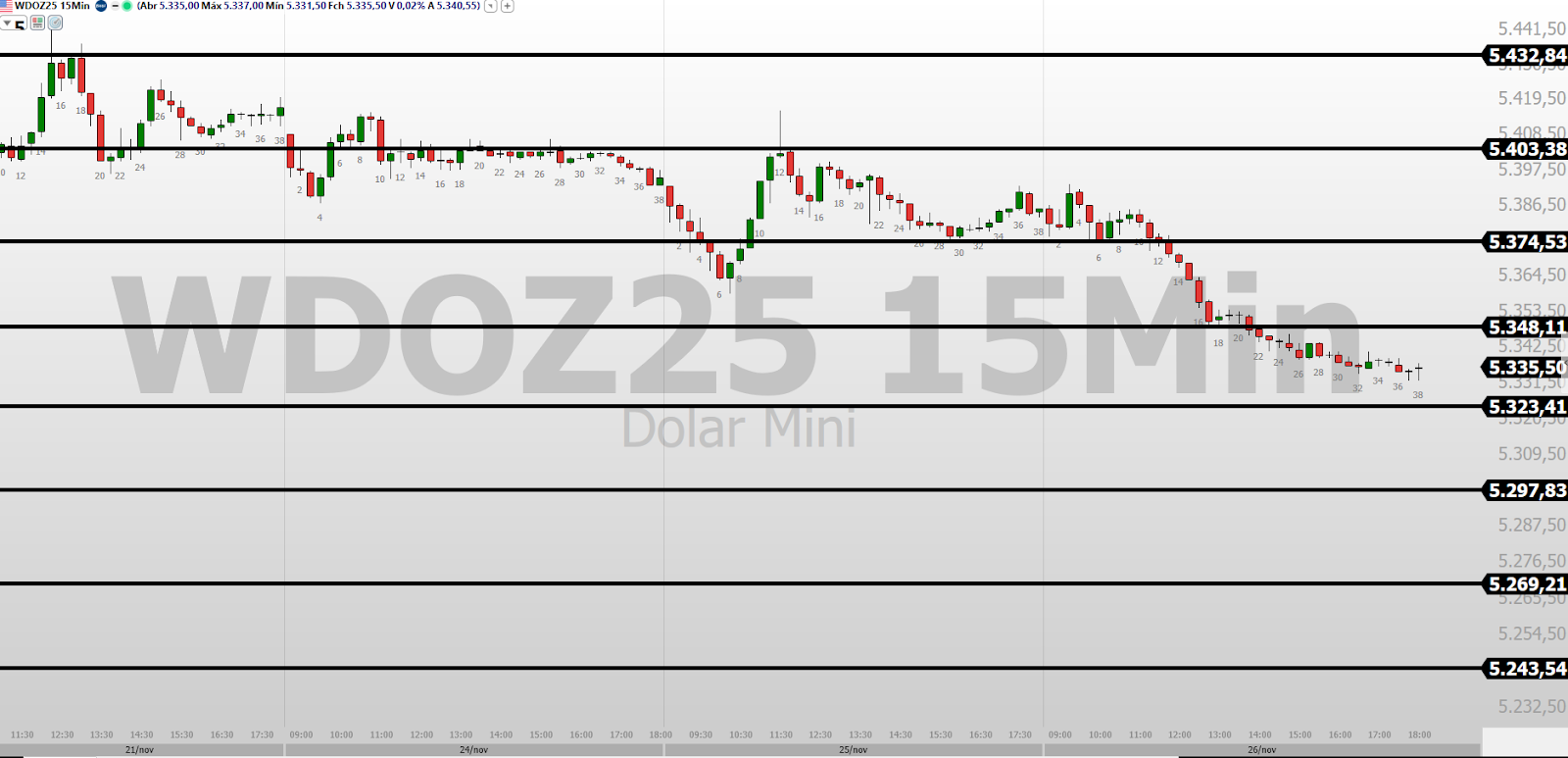 Mini Dólar Futuros com referência do fechamento em 26/11/2025 a máxima 5.392 mínima 5.331 e ajuste 5.340.