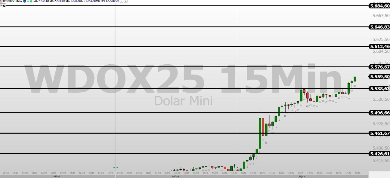 Nesta segunda-feira (13/10/2025), se o dólar futuro romper e se mantiver acima do 5.576, temos pontos de resistências nas regiões de preços 5.612, 5.646 e 5.684.
