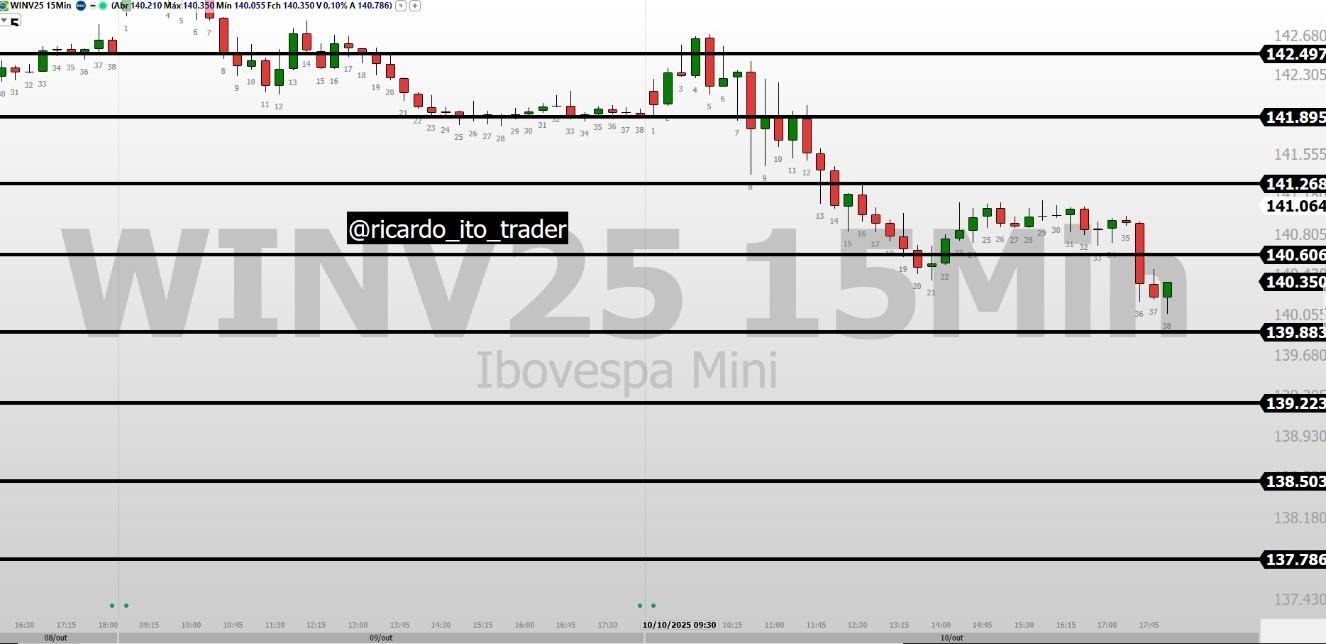 Mini Ibovespa Futuros com referência do fechamento em 10/10/2025, fazendo máxima 142.685, mínima 140.055 e ajuste 140.786.