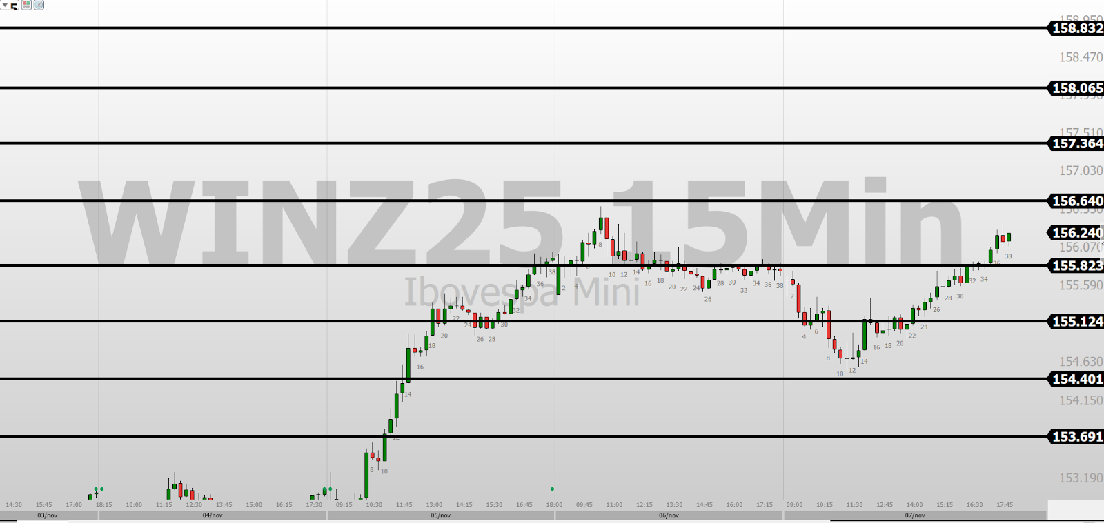 Nesta segunda-feira (10/11/2025). rompendo e trabalhando acima da região de preço 156.640, pode encontrar resistências nas regiões de preços 157.364, 158.065 e 158.832.