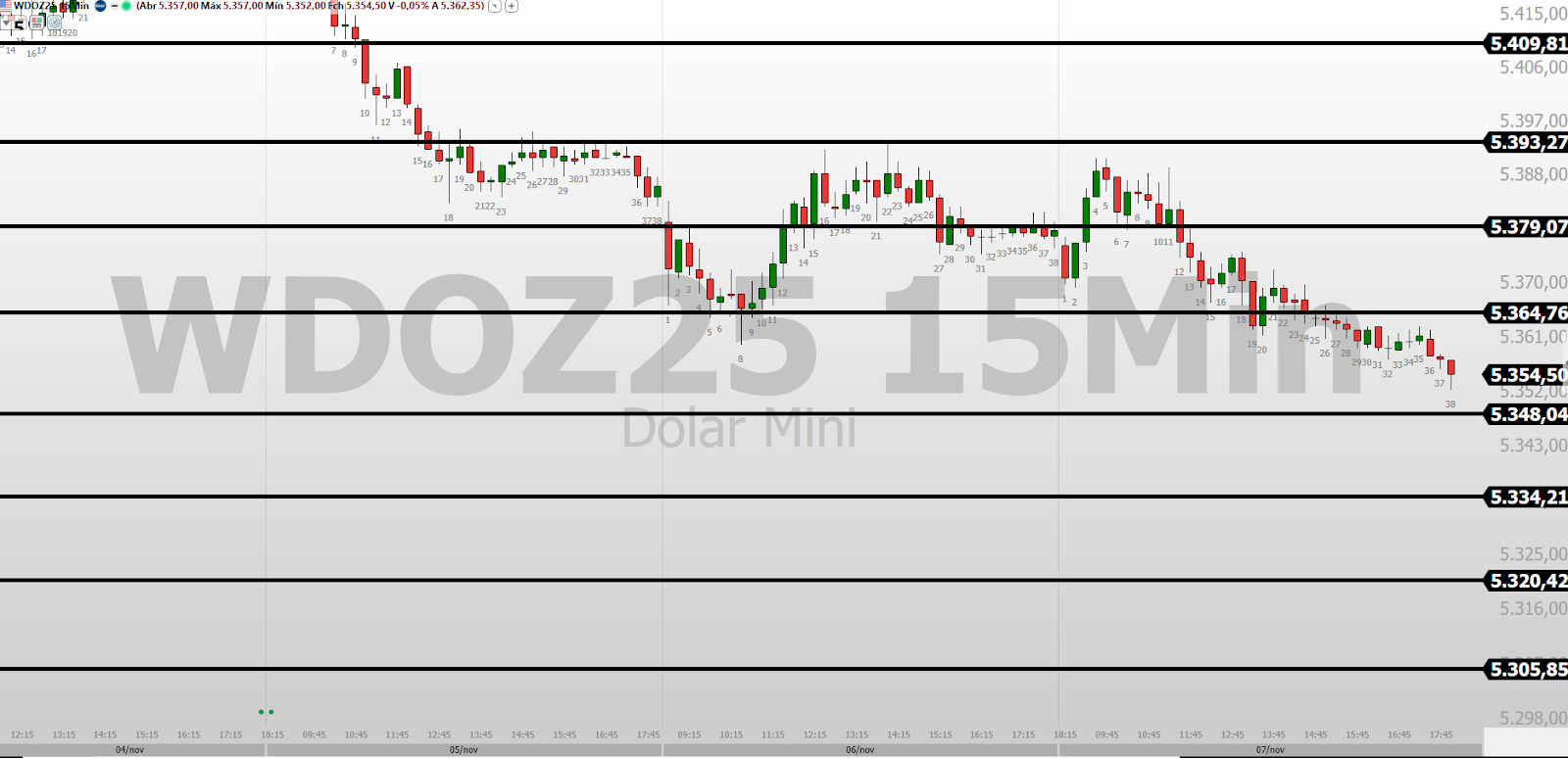 Nesta segunda-feira (10/11/2025), se o dólar futuro romper e se mantiver acima do 5.364, temos pontos de resistências nas regiões de preços 5.379, 5.393 e 5.409.