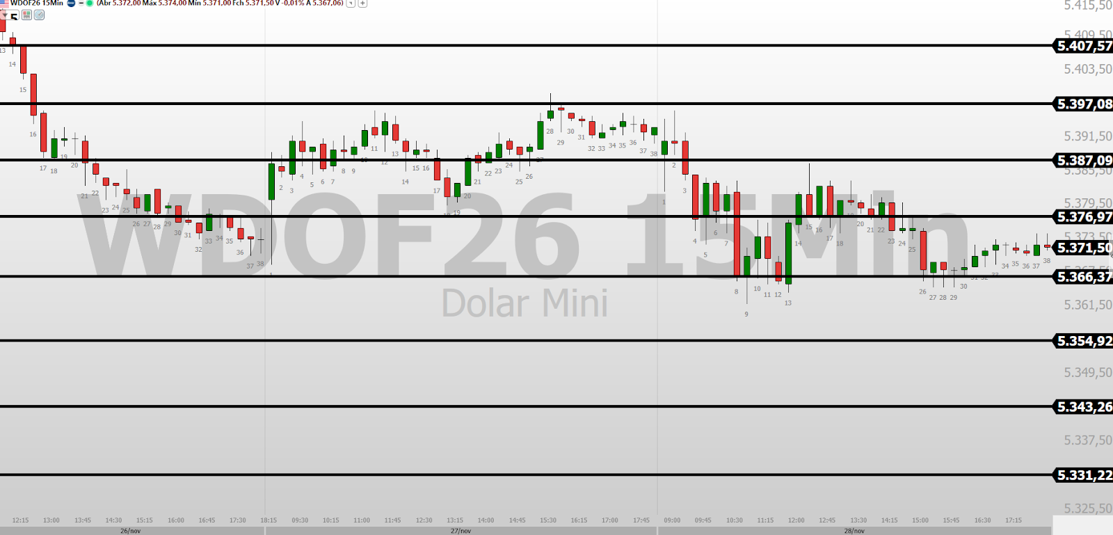 Nesta segunda-feira (01/12/2025), se o dólar futuro romper e se mantiver acima do 5.376, temos pontos de resistências nas regiões de preços 5.387, 5.397 e 5.407.
