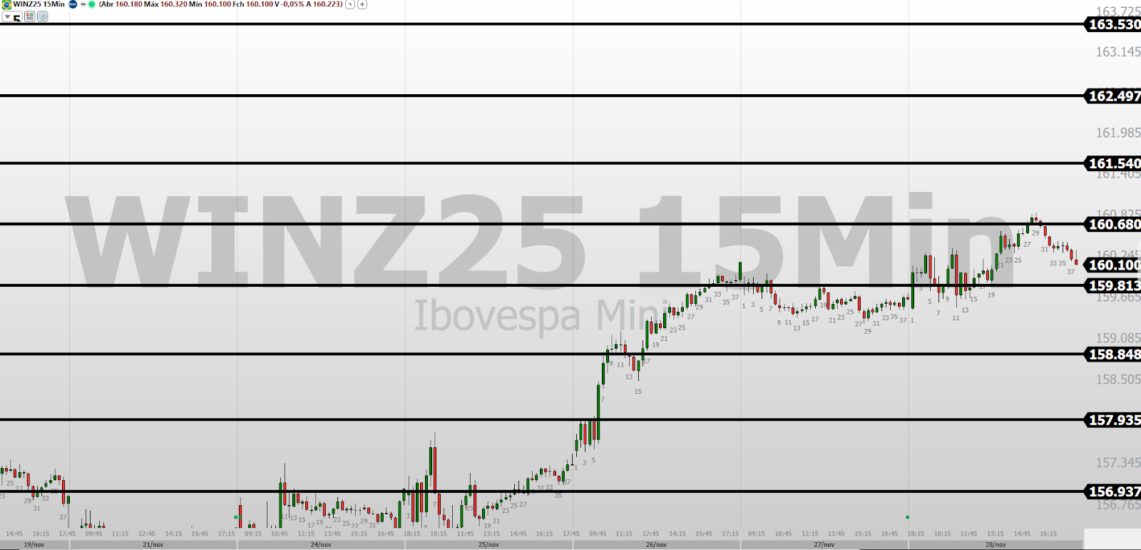 Nesta segunda-feira (01/12/2025), rompendo e trabalhando acima da região de preço 160.680, pode encontrar resistências nas regiões de preços 161.540, 162.497 e 163.530.