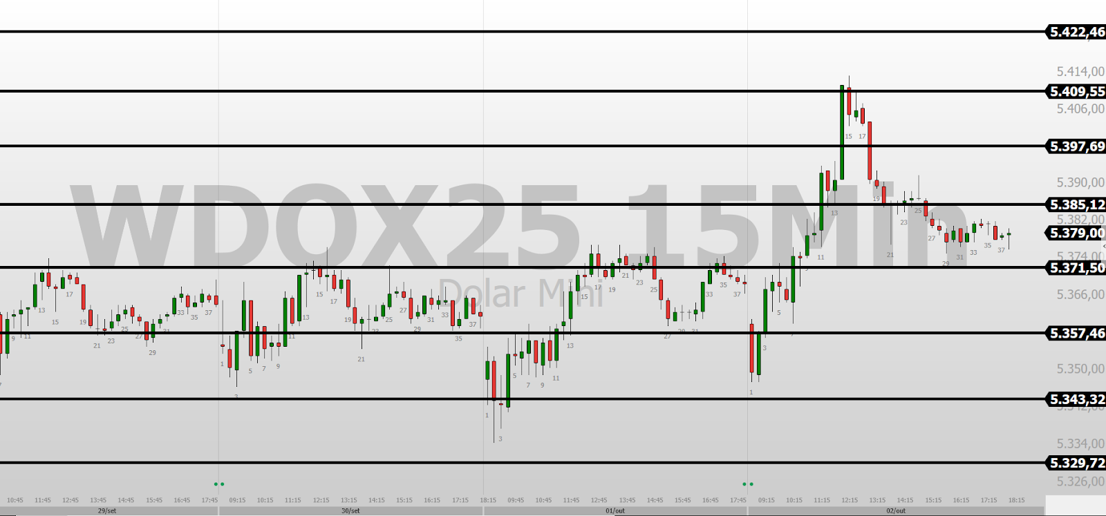 Nesta sexta-feira (03/10/2025), se o dólar futuro romper e se mantiver acima do 5.385, temos pontos de resistências nas regiões de preços 5.397, 5.409 e 5.422.