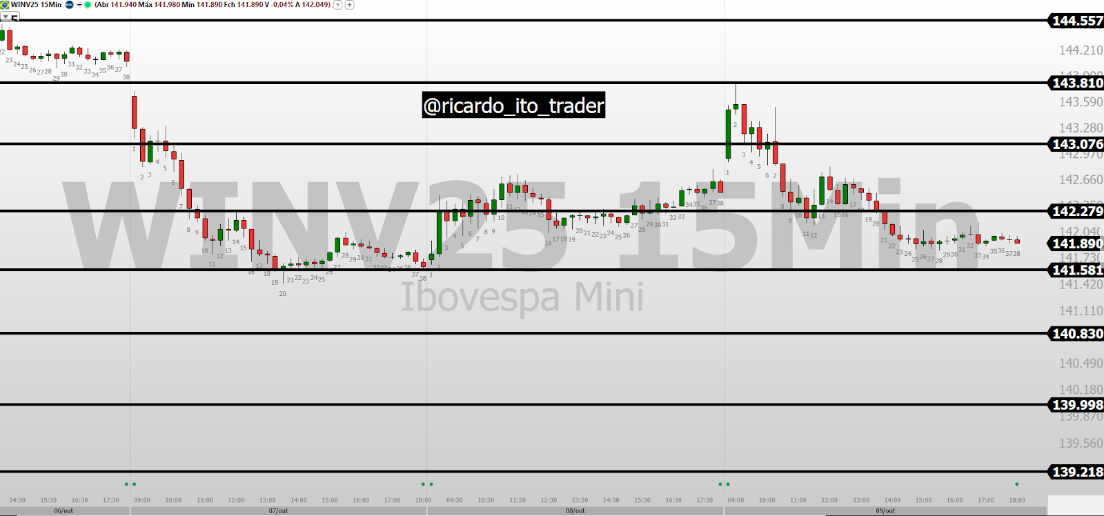 Nesta sexta-feira (10/10/2025), rompendo e trabalhando acima da região de preço 142.279, pode encontrar resistências nas regiões de preços 143.076, 143.810 e 144.557.