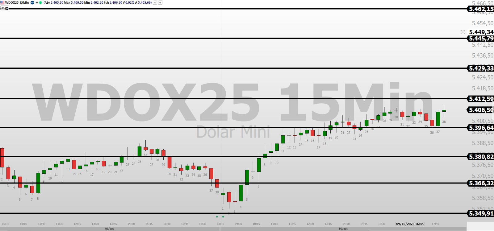 Nesta sexta-feira (10/10/2025), se o dólar futuro romper e se mantiver acima do 5.412, temos pontos de resistências nas regiões de preços 5.429, 5.445 e 5.462.