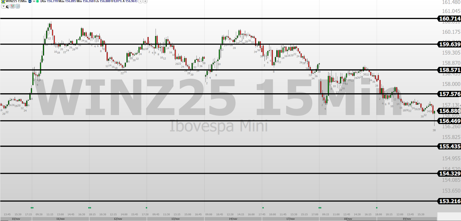 Mini Ibovespa Futuros com referência do fechamento em 19/11/2025, fazendo máxima 158.440, mínima 156.260 e ajuste 156.961.