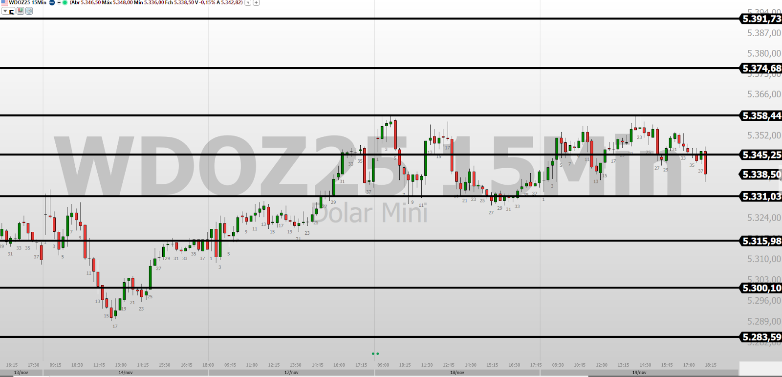 Nesta sexta-feira (21/11/2025), se o dólar futuro romper e se mantiver acima do 5.345, temos pontos de resistências nas regiões de preços 5.358, 5.374 e 5.391.