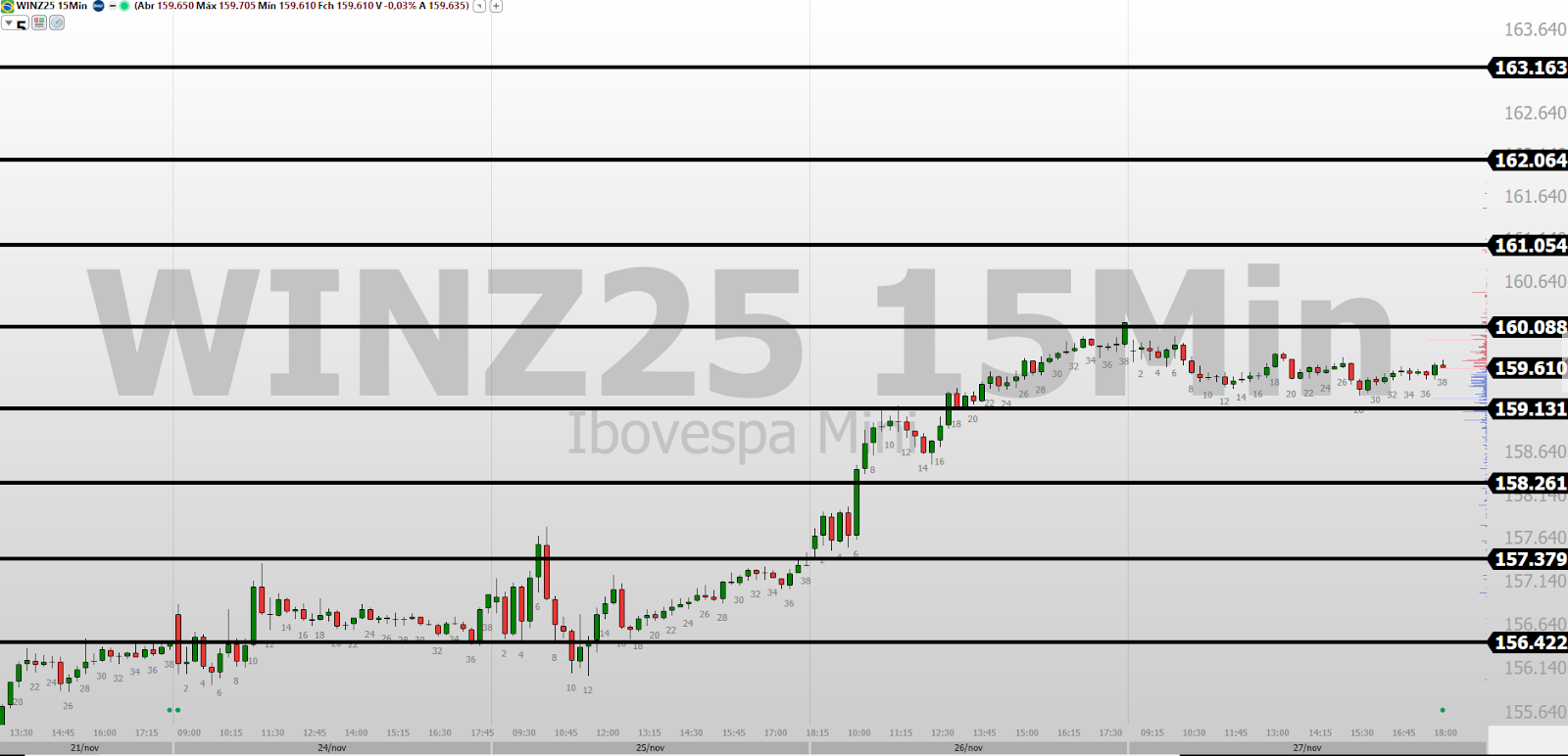 Mini Ibovespa Futuros com referência do fechamento em 27/11/2025, fazendo máxima 159.980, mínima 159.285 e ajuste 159.635.