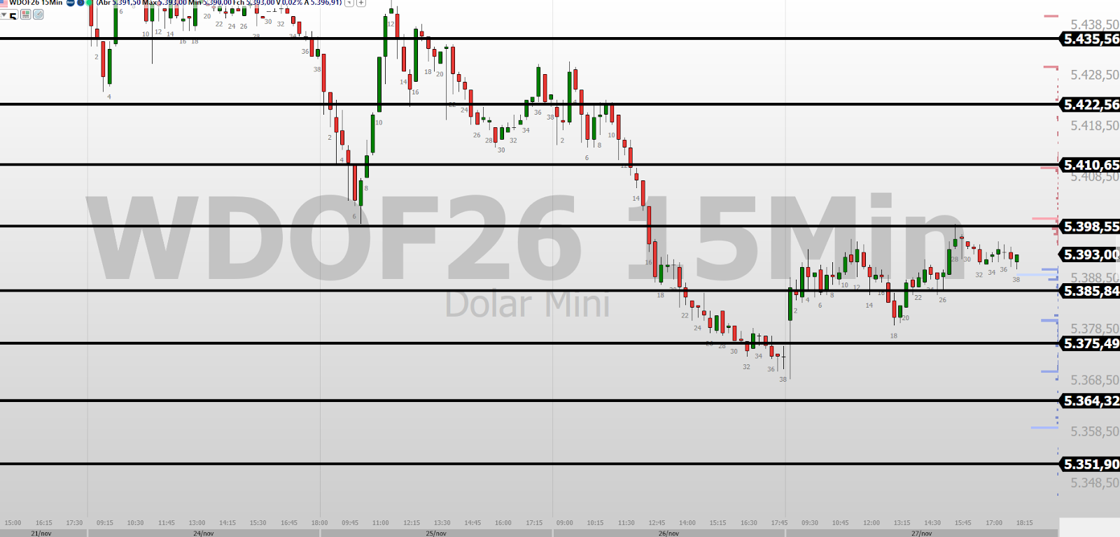 Mini Dólar Futuros com vencimento do contrato WDOZ25 a partir de 28/11/2025, o contrato a ser negociado é WDOF26, com referência do fechamento em 27/11/2025 a máxima 5.399 mínima 5.368 e ajuste 5.396.