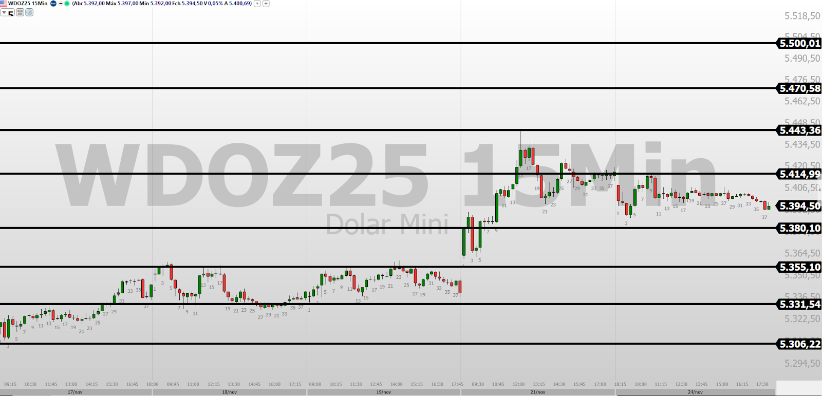 Nesta terça-feira (25/11/2025), se o dólar futuro romper e se mantiver acima do 5.414, temos pontos de resistências nas regiões de preços 5.443, 5.470 e 5.500.