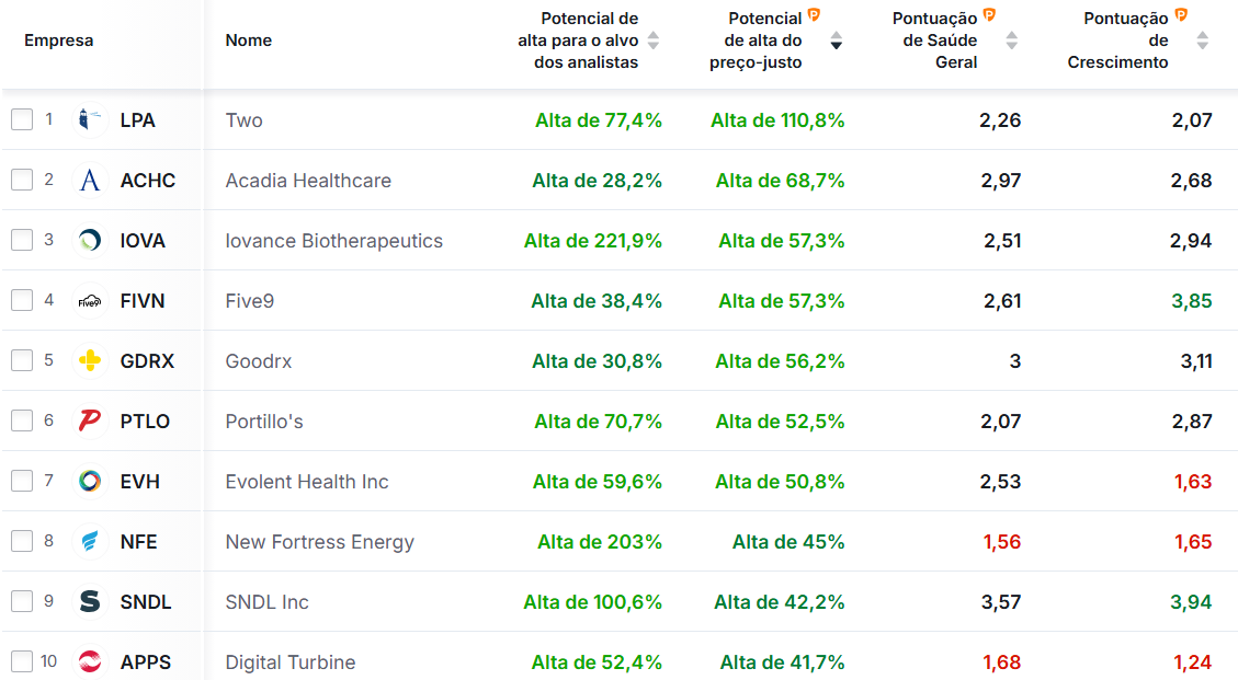 Com esses parâmetros, identificamos pouco mais de 100 oportunidades. Abaixo, você confere as 10 ações com maior potencial, segundo analistas: