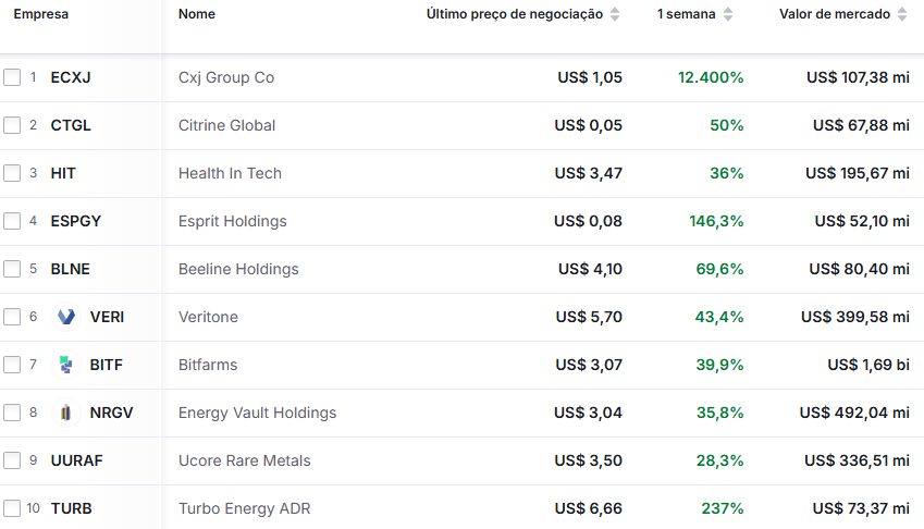 Entre as dez melhores da última semana está a Cxj Group (OTC:ECXJ), que subiu 12.400% nesse período.