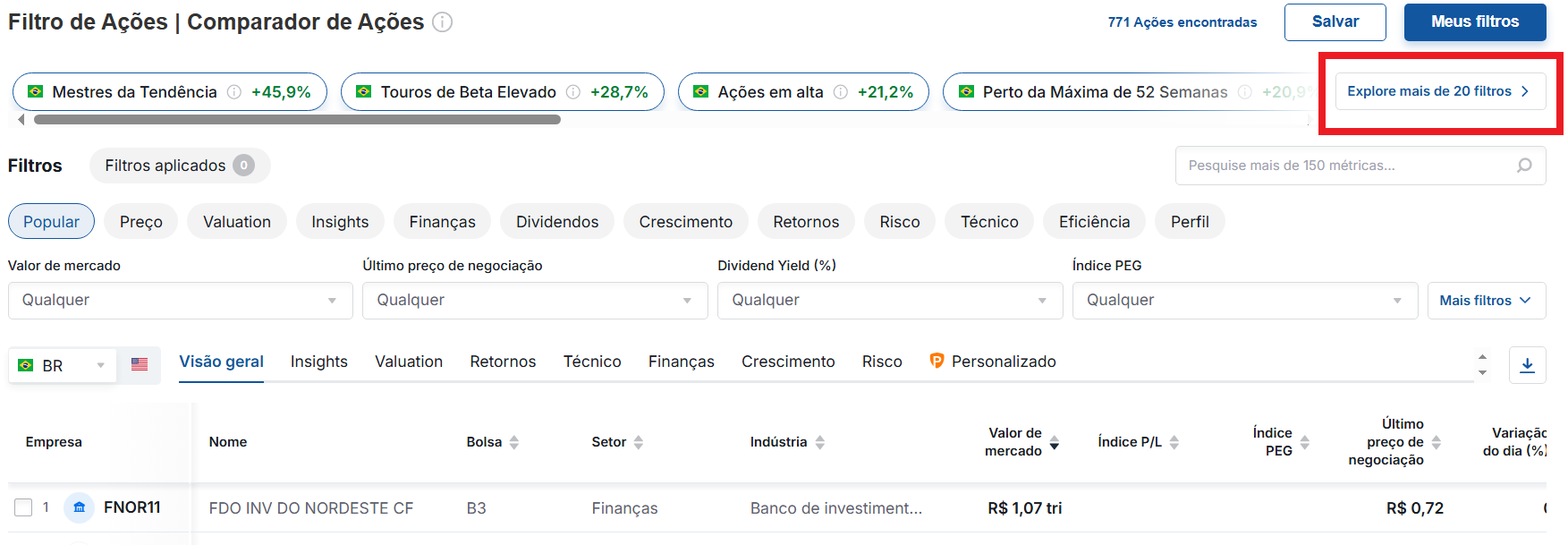 Observação: alguns filtros são gratuitos, enquanto outros são exclusivos para assinantes dos planos InvestingPro e Pro+.