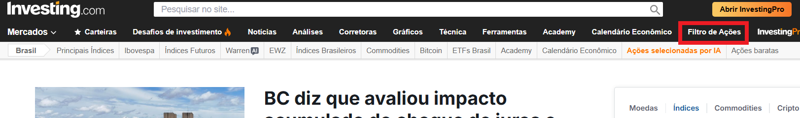 Na página inicial do Investing.com, clique em “Filtro de ações” no menu superior preto.