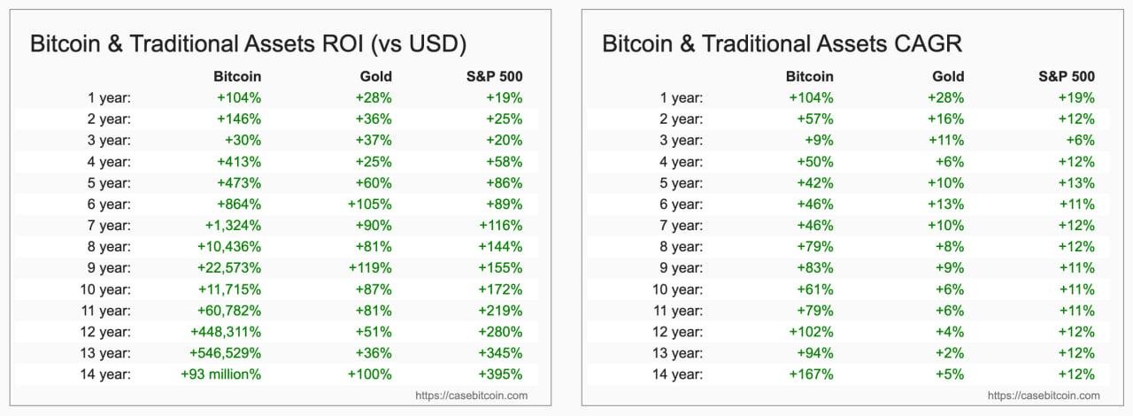 BTC x Ouro x S&P 500 - ROI e CAGR