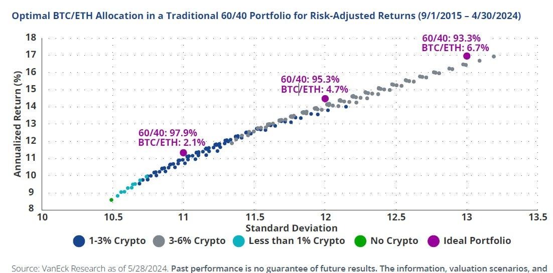 Alocação Ótima Teórica em um Portfólio Tradicional (60/40 - 60% Ações EUA e 40% Títulos de Dívida do Governo dos EUA) com Cripto (BTC/ETH) ou Não. Fonte: VanEck