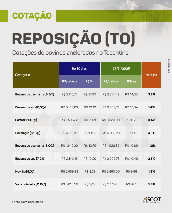 Os preços permaneceram estáveis em todas as categorias. A oferta de boiadas esteve curta e os negócios seguiram devagar, com baixo volume, suficiente apenas para repor as escalas de abate, que cobriam, em média, seis dias.