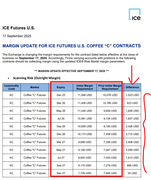 Junto com as chuvas o outro evento que ajudou na realização do mercado foi o novo aumento do valor da chamada de margem inicial exigida pela bolsa de NY. Em apenas 2 dias a bolsa de NY aumentou a “margem inicial” de 8.000 US$/contrato para 11.600 US$/contrato para o vencimento dez-25 e entre 2.000-2.500 US$/lote para os demais vencimentos futuros.