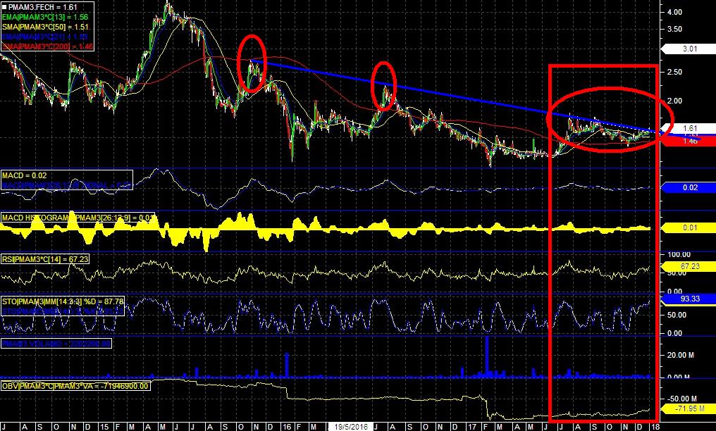 O forte e consistente volume apresentado nesses últimos dias, também coerente com uma média crescente de volume que também pode ser visto pelo "OBV" abaixo no primeiro gráfico, foi o suficiente para que PMAM3 rompesse uma LTB de 2 anos no fechamento de hoje, 02-01-2018