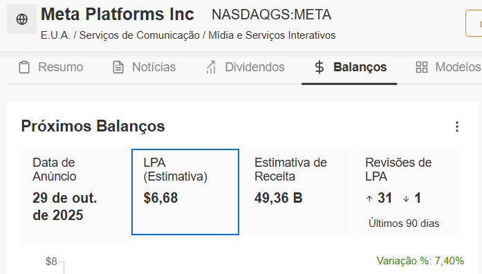 Projeções: LPA de US$ 6,68 (+10,8%) e receita de US$ 49,3 bilhões (+21,6%); volatilidade implícita: ±7,1%.