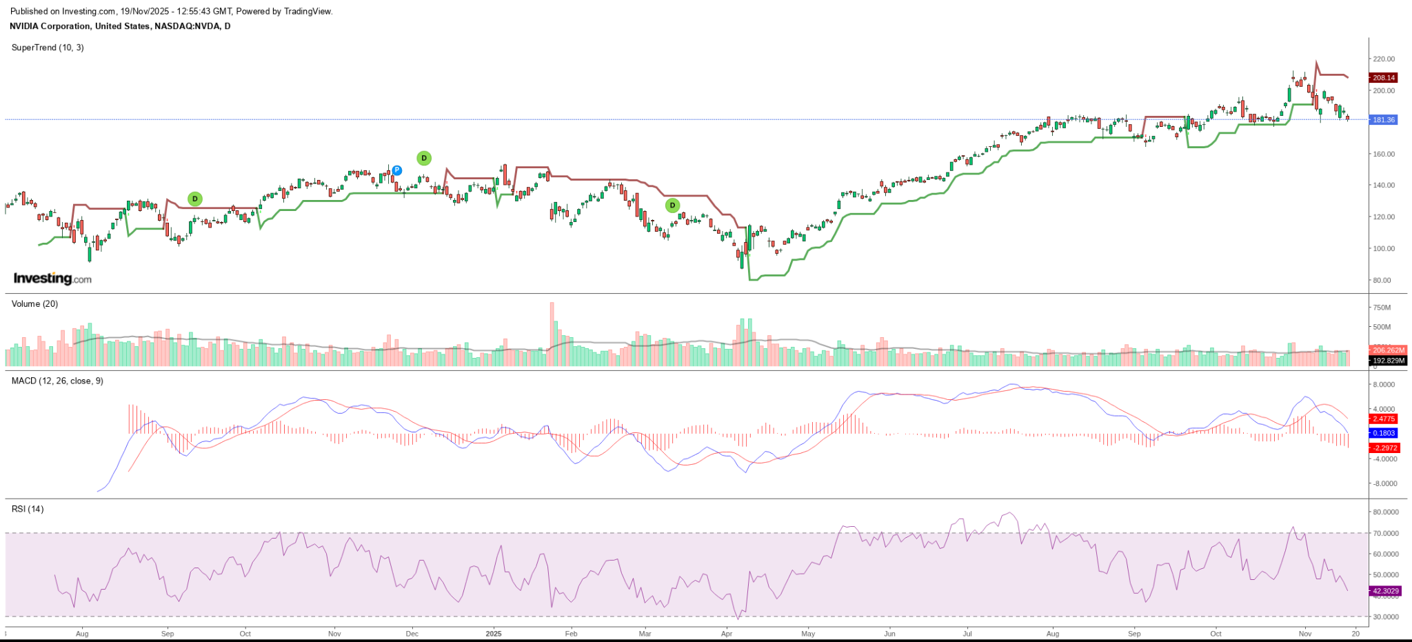 Se a Nvidia fechar acima da faixa de US$ 193 a US$ 194, o modelo detecta a primeira sinalização real de retomada de momentum comprador.