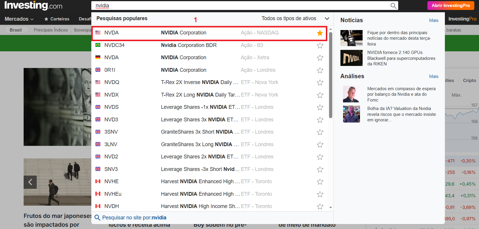 No site do Investing.com, digite “Nvidia” na barra de busca e entre na página da ação NVDA.