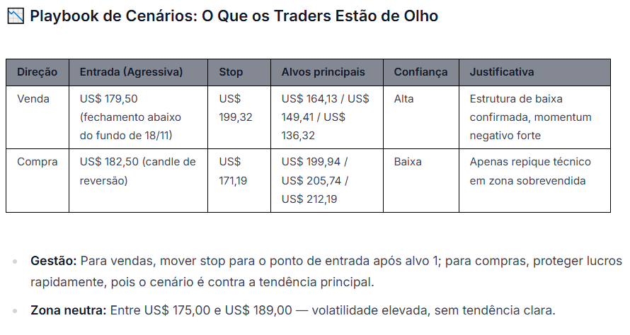“Um fechamento abaixo de US$ 179 elimina o suporte mais importante. Abaixo de US$ 168,40, o cenário de baixa estaria estruturalmente confirmado.”