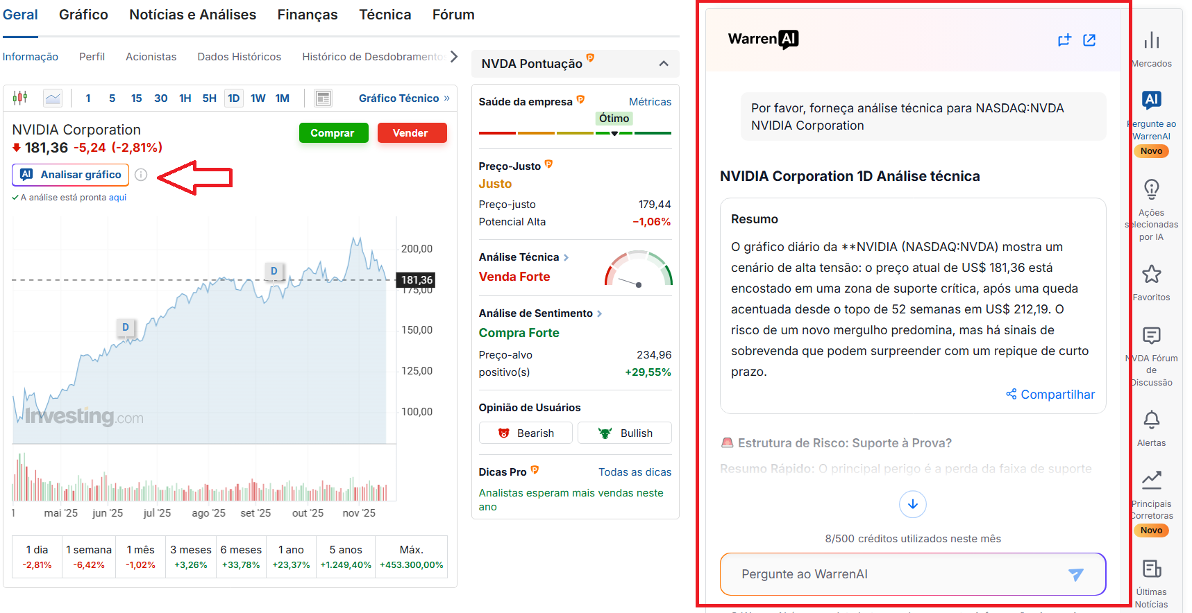 Agora vamos ver o que o WarrenAI enxerga atualmente no gráfico diário de Nvidia.