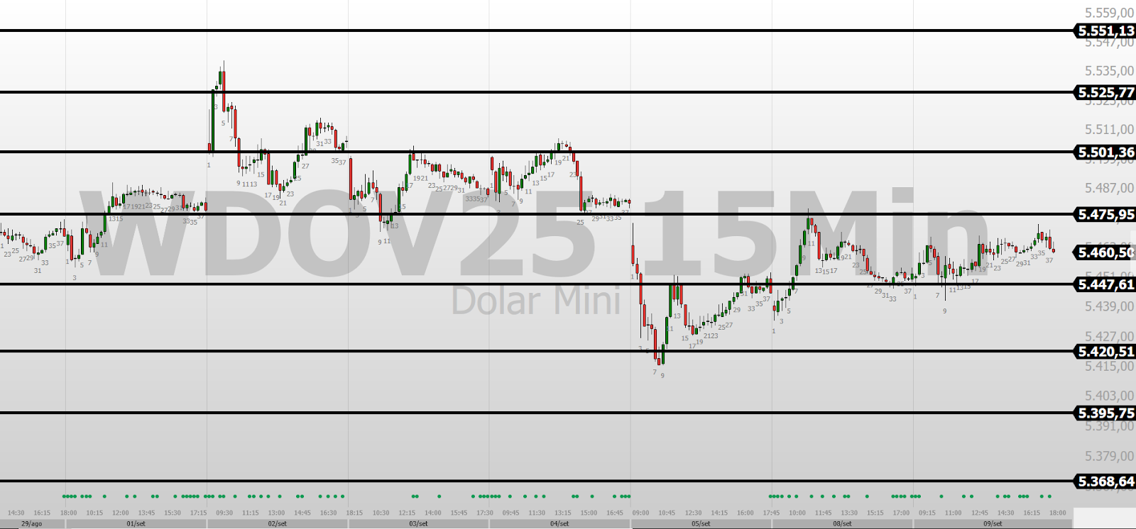 Nesta quarta-feira (10/09/2025), se o dólar futuro romper e se mantiver acima do 5.475, temos pontos de resistências nas regiões de preços 5.501, 5.525 e 5.551.