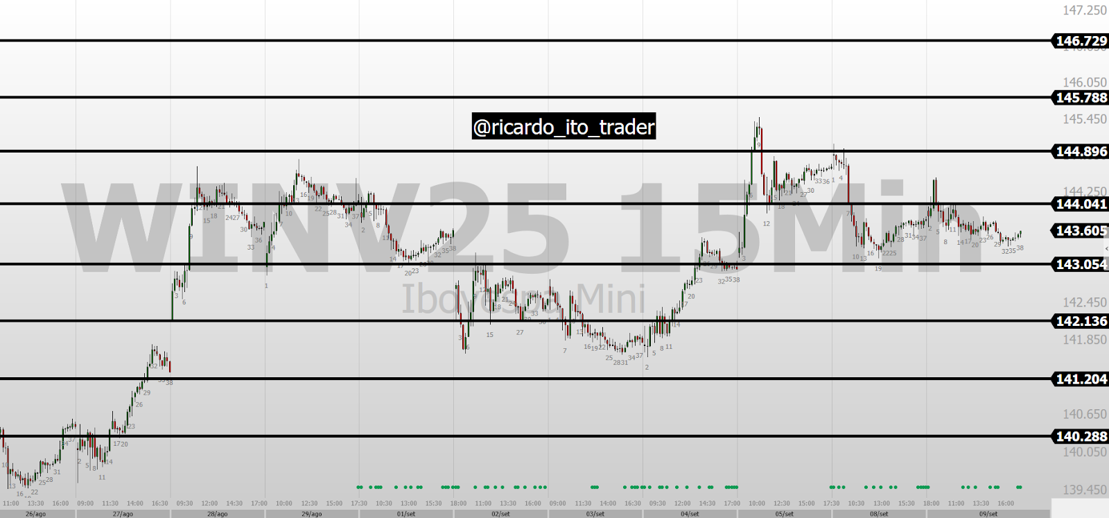 Nesta quarta-feira (10/09/2025), rompendo e trabalhando acima da região de preço 144.041, pode encontrar resistências nas regiões de preços 144.896, 145.788 e 146.729.