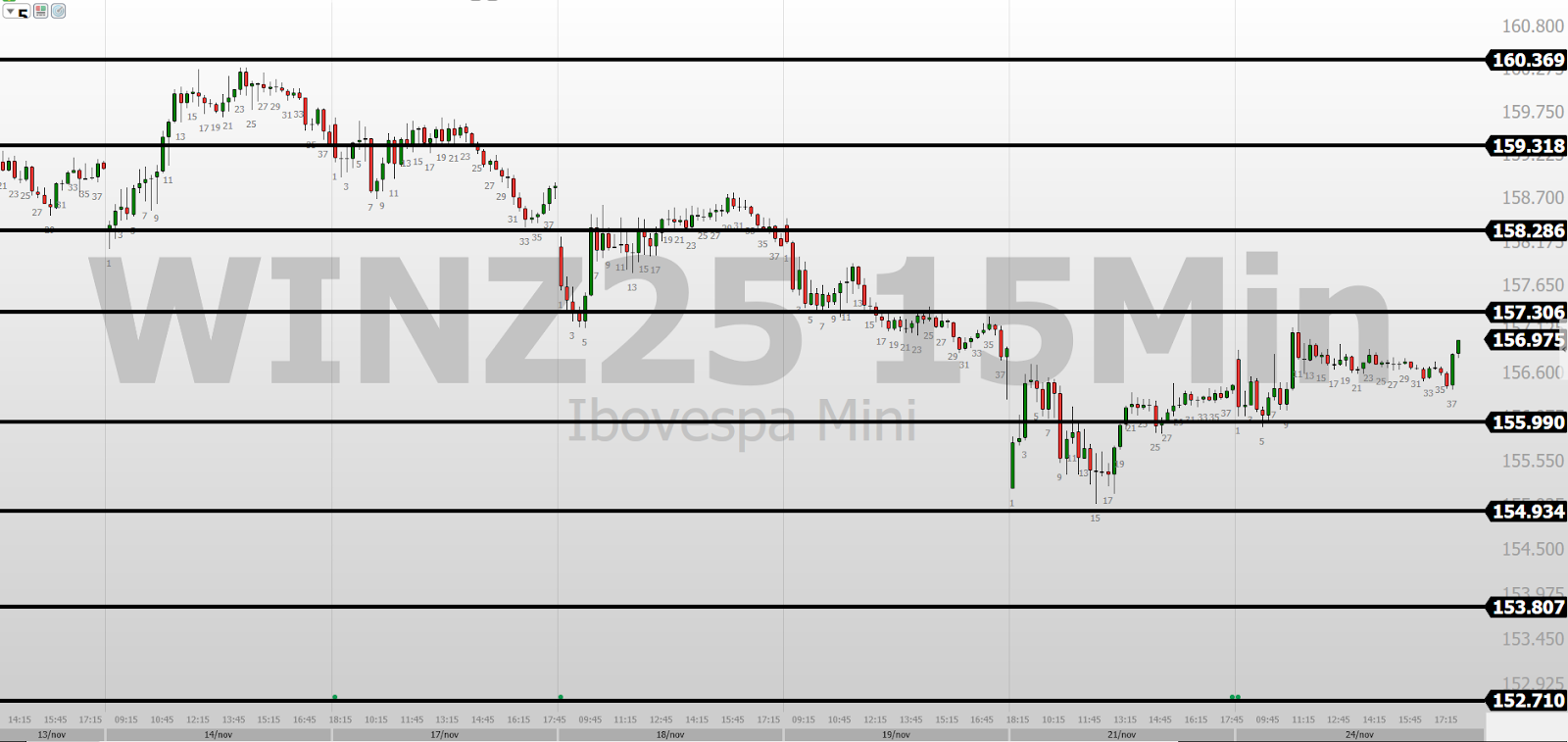 Nesta quarta-feira (26/11/2025), rompendo e trabalhando acima da região de preço 157.760, pode encontrar resistências nas regiões de preços 158.689, 159.630 e 160.514.